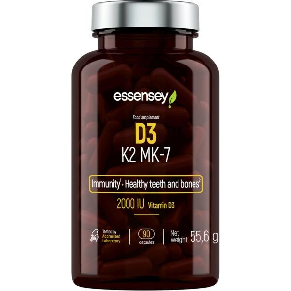 ESSENSEY D3 K2 MK-7. Doplnok stravy. Prípravok v kapsuliach obsahuje 2000 IU vitamínu D3 a vitamín K2 MK-7. Vitamín D prispieva k normálnej funkcii imunitného systému. Vitamín D prispieva k udržaniu normálneho stavu kostí a zubov.