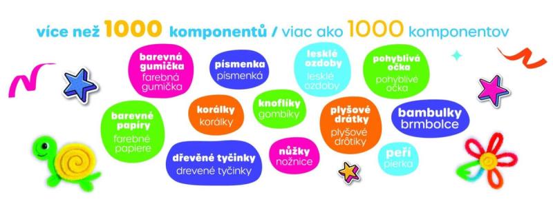 Více než 1000 různorodých komponentů pro nekonečné hodiny zábavného tvoření. Vše je uloženo v praktickém uzavíratelném plastovém boxu s víkem a uchem, takže se nic neztratí a snadno se uklízí i přenáší.