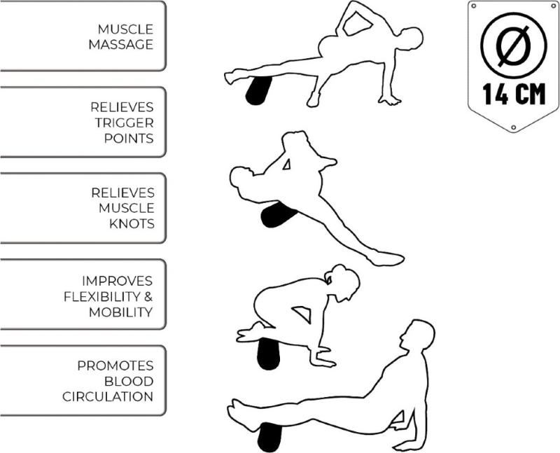 Díky svým rozměrům 33 × 14 cm je ideální pro domácí i profesionální použití. Válec je vyroben z kvalitní EVA pěny s pevnou výztuží z PVC jádra, což zaručuje jeho odolnost a dlouhou životnost i při častém používání. Speciální výstupky na povrchu napodobují tlak prstů maséra, což umožňuje hlubokou masáž svalových uzlin a trigger pointů, a tím přispívá k rychlejší regeneraci.