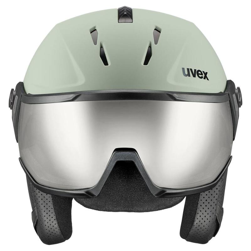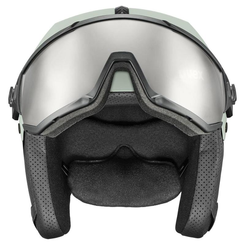 Súčasťou je strieborný zrkadlový štít s technológiou uvex supravision®, ktorá zabraňuje zahmlievaniu a zabezpečuje jasný výhľad aj pri rýchlej jazde. Štít je anatomicky tvarovaný, tesne prilieha k tvári a ponúka tri polohy zastavenia, čím umožňuje jednoduché prispôsobenie aktuálnym podmienkam.