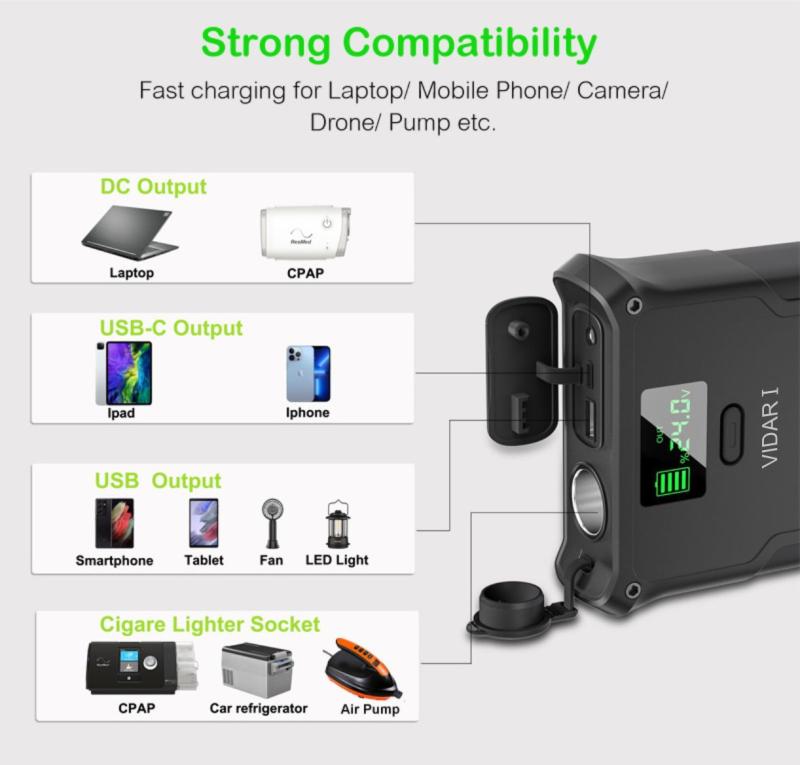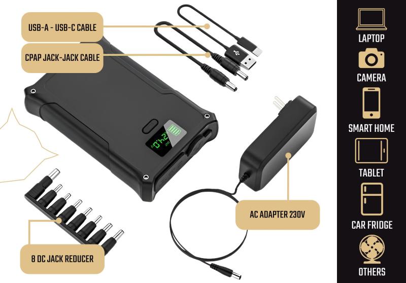 Výstupní konektory jsou navrženy tak, aby pokryly co nejširší spektrum potřeb: cigaretová zásuvka (12-16V/10A, max. 160W), USB-A (5V/3A, 9V/2A, 12V/1.5A, max. 18W), USB-C (5V/3A až 20V/3A, max. 60W) a DC-JACK (5.5/2.1mm) s možností nastavení výstupního napětí až do 24V a výkonem 84W. Díky tomu lze napájet nejen běžné mobilní zařízení, ale i náročnější elektroniku a notebooky.