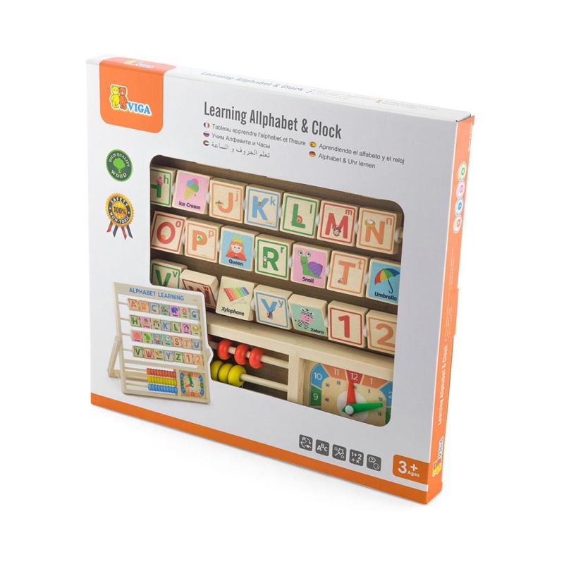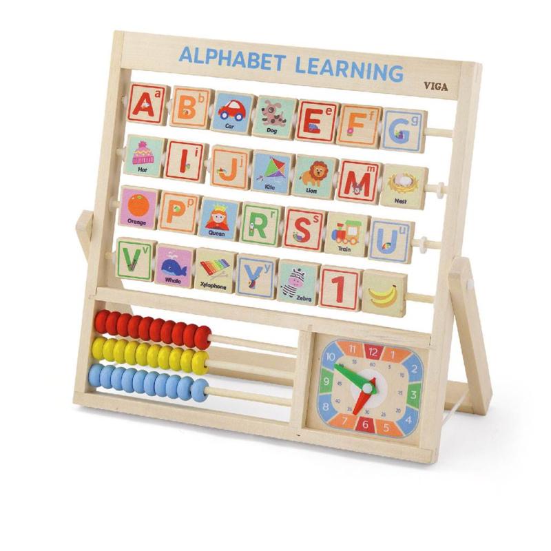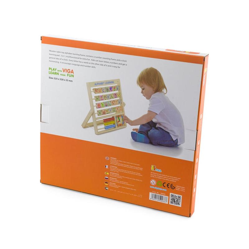 Deska připomínající počítadlo s kostkami abecedy. Každá z kostek abecedy má na zadní straně obrázek odpovídající písmenu v angličtině. Ve spodní desce hračky je umístěno malé počítadlo, na kterém se dítě naučí počítat, sčítat a odčítat do 30. Vedle počítadla jsou hodiny - ideální pro výuku čtení času.Počítadlo je vyrobeno z bukového dřeva a natřeno neškodnými barvami v živých barvách, které dítě zaujmou a povzbudí ho ke hře a zároveň mu poskytnou spoustu zábavy. Naší prioritou je bezpečnost dětí a nejvyšší kvalita hraček, proto dbáme na to, aby barvy, které používáme k malování našich hraček, byly neškodné a splňovaly bezpečnostní normy (EN71 a ASTM).