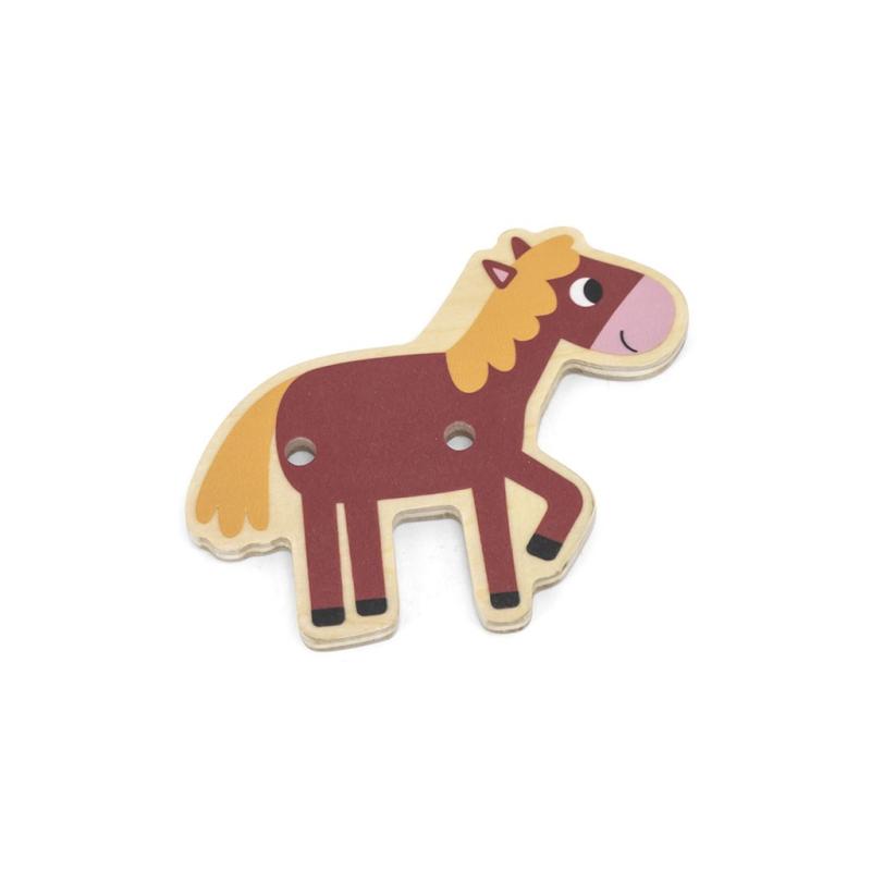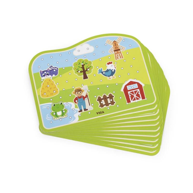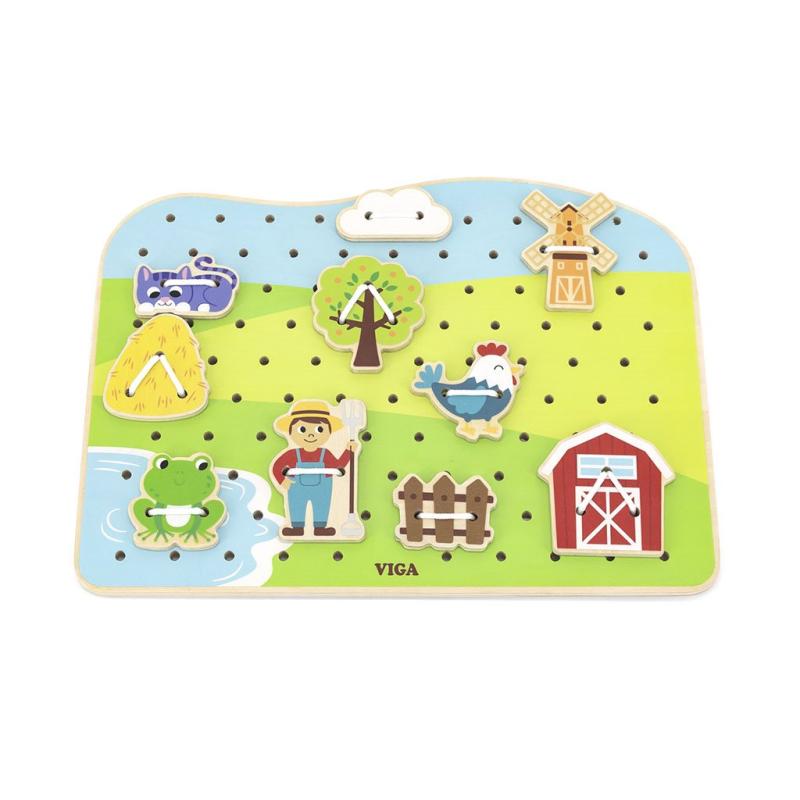 Šněrovací hra - farma od společnosti Viga je jednou z nejkrásnějších hraček, tento typ hry zlepšuje oční a motorickou koordinaci nebo prostorovou orientaci. Součástí hry je dřevěná základna s otvory a ilustrací farmy, 20 krásně malovaných destiček s vyobrazením hospodářských zvířat a okolní přírody a 10 kartiček, které ukazují různé způsoby navlékání doplňků na desku. Dítě přiřazuje a navléká destičky ke vzorům na kartičkách, které jsou střídavě umístěny na základně. Batolata tak mají možnost rozvíjet svou fantazii a mohou si z dostupných dílků sestavit i vlastní vyprávění. Celá hračka je vyrobena z bukového dřeva a natřena netoxickými barvami v zářivých barvách, které upoutají pozornost a povzbudí ke hře a zároveň poskytnou spoustu zábavy. Naší prioritou je bezpečnost dětí a nejvyšší kvalita hraček, proto dbáme na to, aby barvy, které používáme k natírání našich hraček, byly netoxické a splňovaly bezpečnostní normy (EN71 a ASTM).