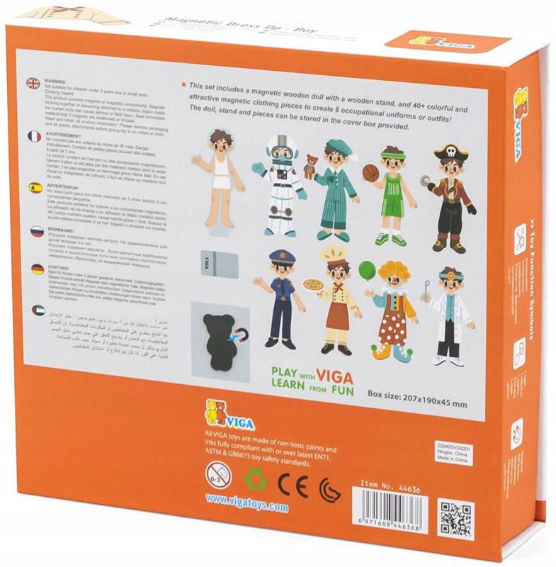 Tato sada obsahuje magnetickou dřevěnou panenku (panáka) s dřevěným stojánkem a více než 40 barevných a atraktivních magnetických kusů oblečení k vytvoření 8 pracovních uniforem nebo oblečení. Panenku, stojan a dílky lze uložit do přiloženého krycího boxu.Vyrobeno z vysoce kvalitního dřevěného materiálu za použití netoxických barev.