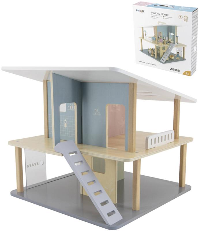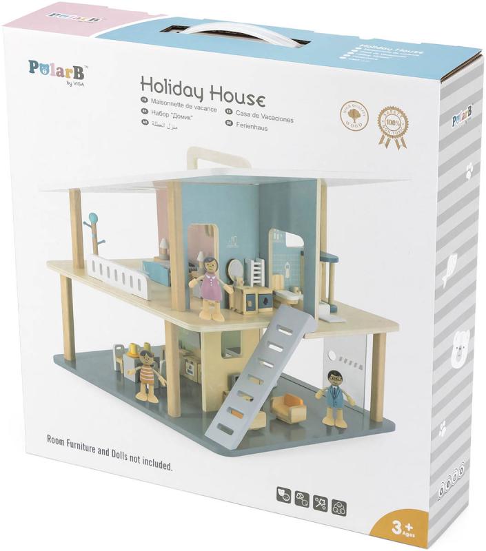 Viga PolarB - Dřevěný prázdninový dům se 2 patry, 5 pokoji a terasou, pro panenky. K domečku lze pořídit doplňky k vybavení kuchyně, obývacího pokoje, ložnice, dětského pokojíku a koupelny. Moderní, patrový domeček pro panenky, snadno přístupný ze všem stran, umožní dětem pohodlnou hru s panenkami i s příslušenstvím do domečku, které není součástí balení. Doplňte prázdninový dům o moderní vybavení a umožněte panenkám cítit se v něm jako doma.