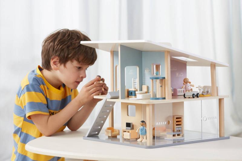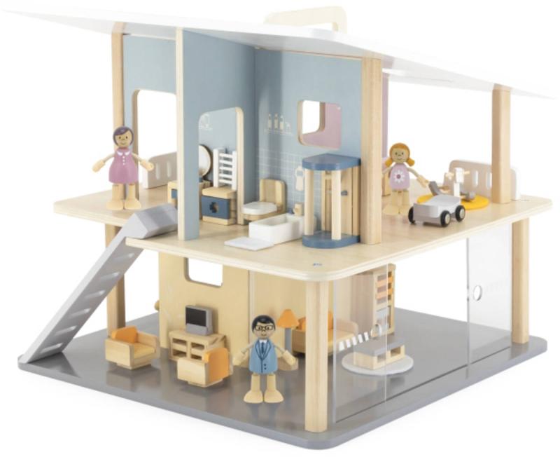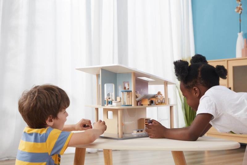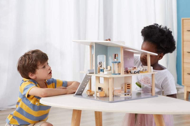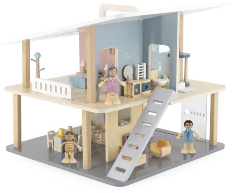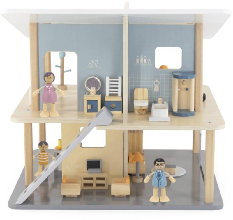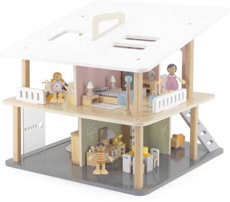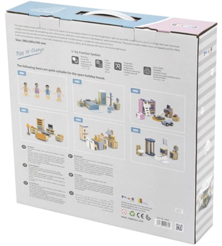 Tento otevřený prázdninový dům se 2 patry, 5 pokoji a terasou povzbudí děti, aby použily svou fantazii. Dívky mohou postavit panenky nebo přidat oblíbené kousky k navrhování vlastního domu s hračkami. Samostatně lze k domečku pořídit dřevěné panenky i dílky k postavení kuchyně, obývacího pokoje, ložnice, dětského pokojíku a koupelny. Tyto díly umožňují nekonečné hodiny poutavého a zábavného hraní a naučí děti, jak zvládat domácnost. Přenosné provedení je vhodné pro snadné přenášení a skladování. Pomůže rozvíjet sociální dovednosti, představivost a kreativní schopnosti dětí při hraní s hračkami v jejím oblíbeném domečku pro panenky.