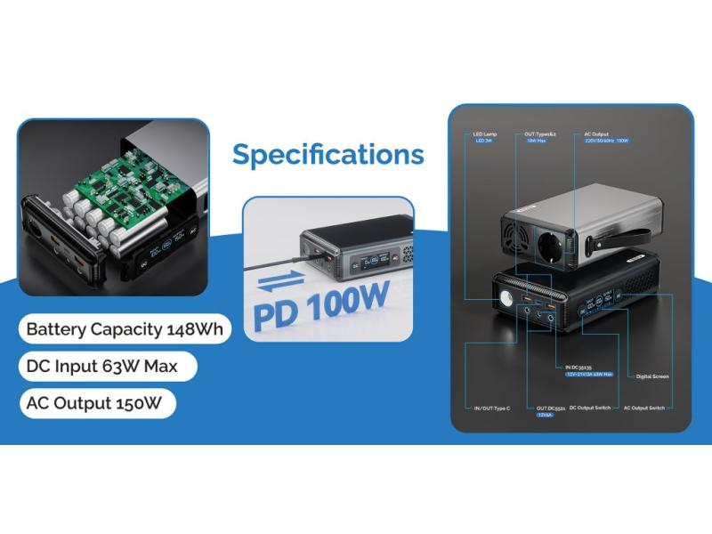 - Různé výstupy včetně USB-C, USB-A, DC jack 5521 a AC 230 V pro univerzální využití