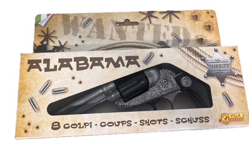 Kovbojská kapslíková pistole/kolt kovová, 8 ran (pistole na kapslíky, na kapsle) barva černá a šedá. Tato propracovaná pistole/kolt Alabama kovová, patří mezi oblíbené dětské kapslíkové zbraně. S touto parádou budeš hvězdou každého karnevalu.