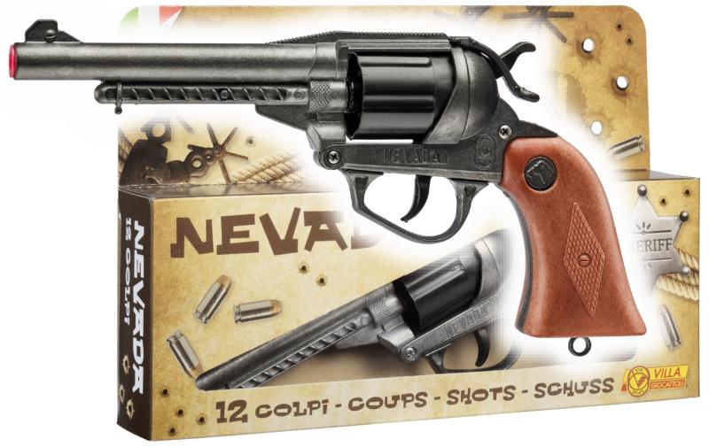 Kovbojská kapslíková pistole/kolt kovová,12 ran (pistole na kapslíky, na kapsle). Krásná propracovaná pistole/kolt Nevada kovová, patří mezi oblíbené dětské kapslíkové zbraně. S touto parádou budeš hvězdou každého karnevalu.