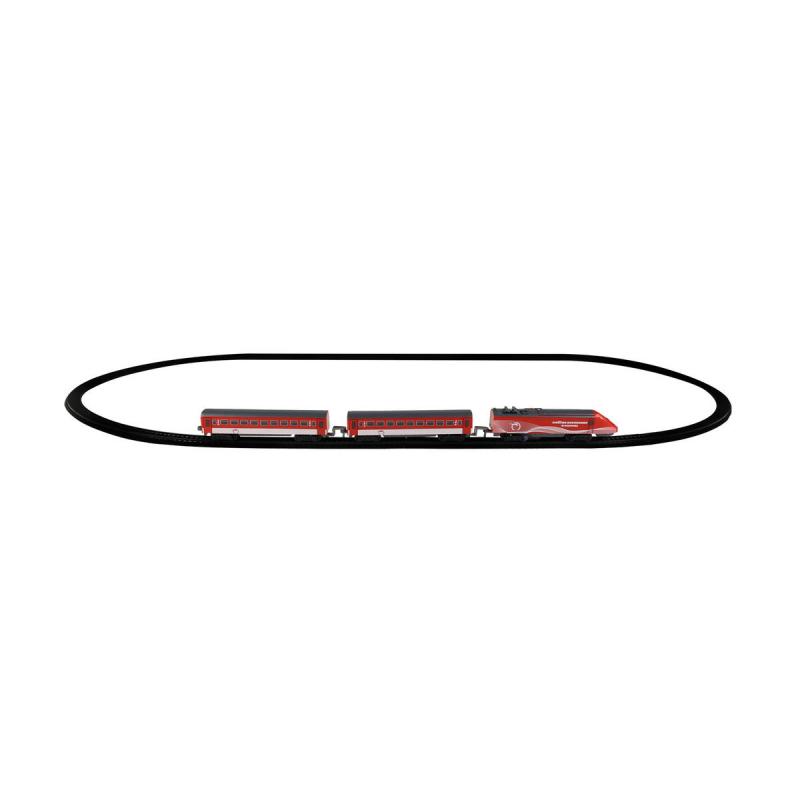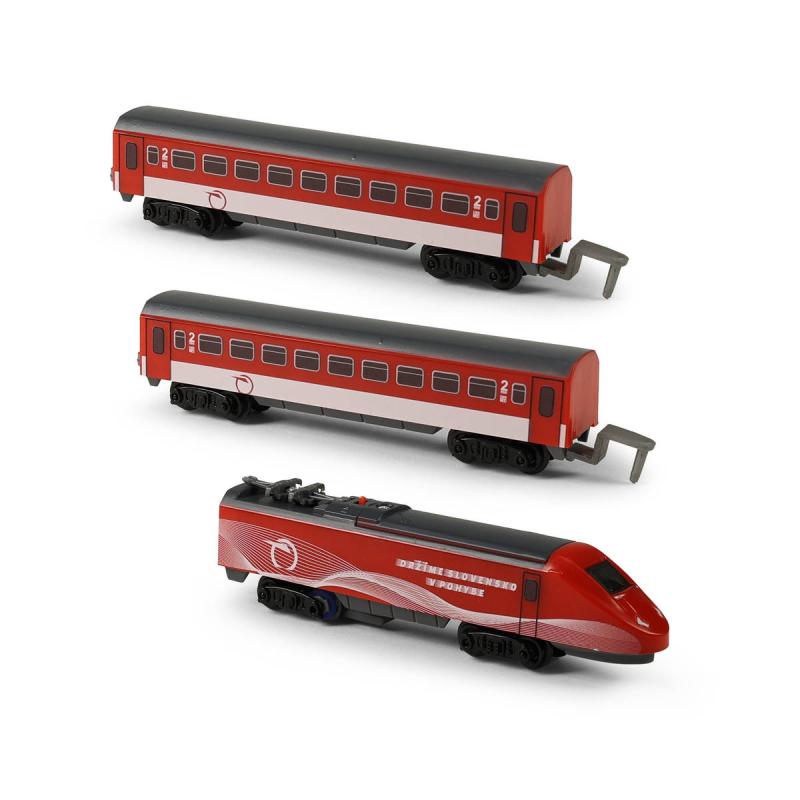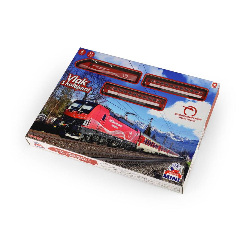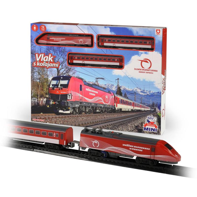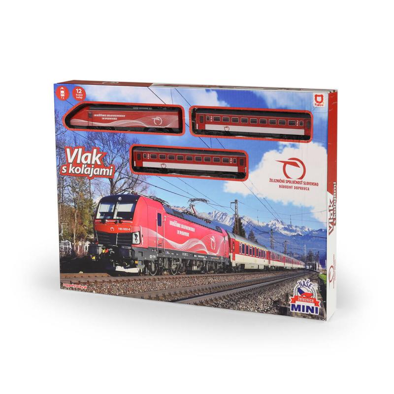 Milujete cestování vlakem? Tak sestavte koleje, postavte na ně lokomotivu, připojte vagóny a vzhůru za dobrodružstvím! Originální vlak Slovenské dráhy obsahuje lokomotivu a 2 vagónky, 8 zahnutých a 4 rovné koleje. Lze vytvořit kolejiště až do velikosti 96 x 58 cm. Rozteč kolejí je 1,4 cm. Lokomotiva měří na délku 14 cm a vagón 13,5 cm.