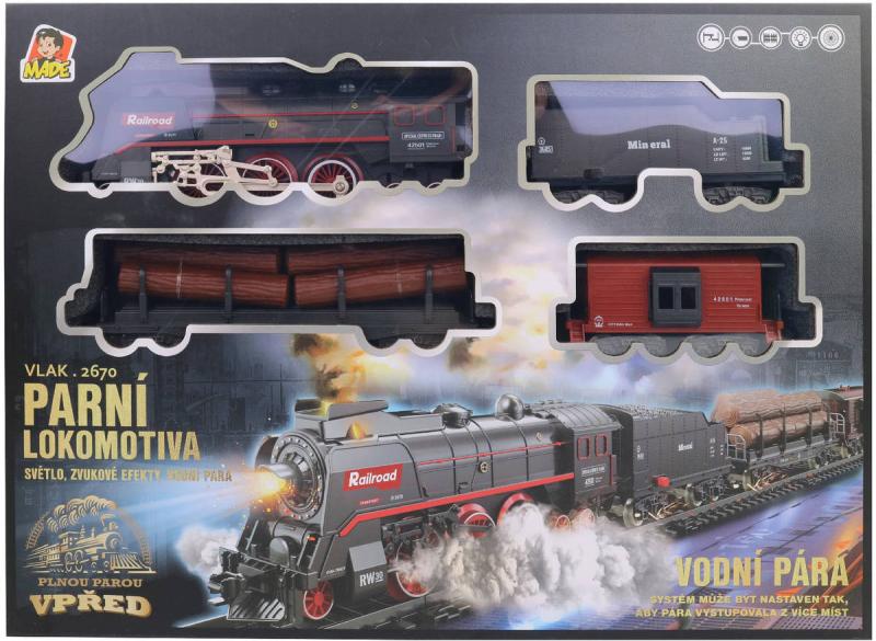 Vlaková nákladní kouřící souprava s kolejemi, kruhová dráha k sestavení, trať 92cm, lokomotiva 22cm, s efektem kouře (vodní pára). Vláček na baterie, se světlem a zvukem.Velkou zajímavostí této sady je efekt páry, která vychází nejen z komína, ale i z podvozku lokomotivy. Dopřejte svému dítěti stát se strojvedoucím vlastního neobvyklého vlaku. Pro zpestření celé hry má vlak zvukové a světelné efekty. Montáž kolejnic je velmi jednoduchá.