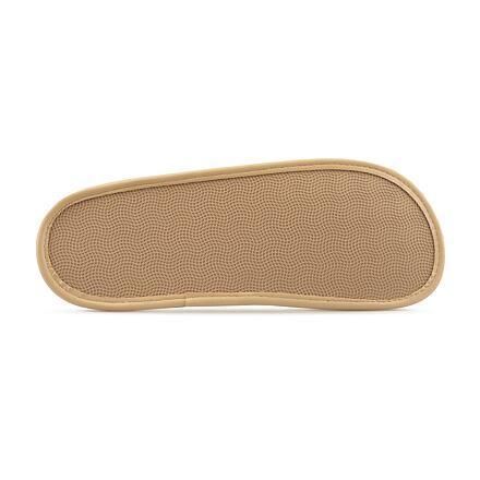 Tyto bačkory mají pevnou, protiskluzovou podrážku, a tak jsou vhodné na všechny druhy podlah. Svrchní materiál je hebký velur v přírodní hnědé barvě.
