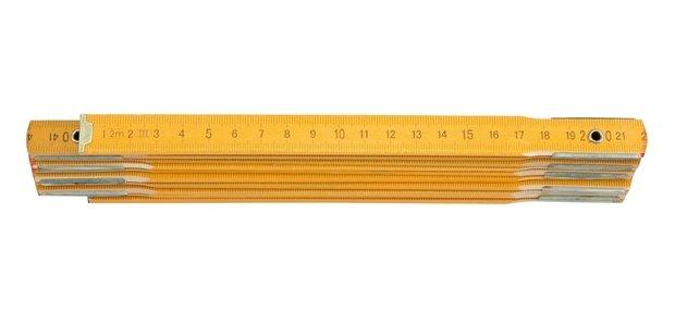 Klasický dřevěný skládací metr vyrobený z bukového dřeva, lakovaná žlutě, chráněná proti působení vlhkosti.Metr je spojený mosazným kováním.