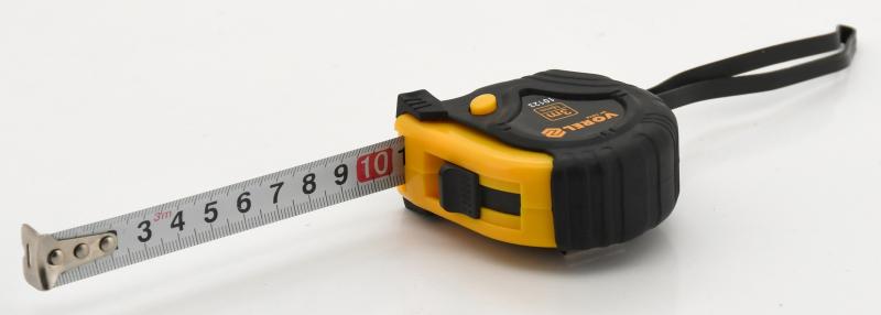 Svinovací metr 3 m dlouhý a 16 mm široký zakončený pohyblivým háčkem. Pouzdro je vyrobeno z plastu, vyztuženo gumovými podložkami a aretačním knoflíkem.