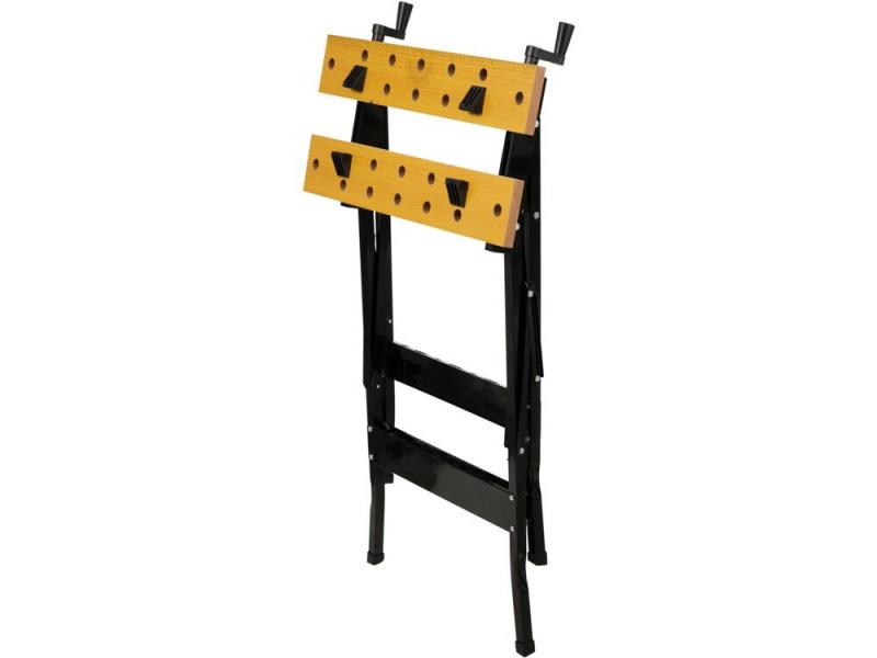 Skládací pracovní stůl se dvěma deskami z MDF pro upínání obrobků.Stůl je určen pro dílenské a montážní práce s povoleným zatížením 70 kg. Pracovní plocha je tvořena dvěma deskami a je uzpůsobena pro upnutí obrobku. Desky jsou navíc opatřené otvory pro instalaci dalších prvků upevňujících materiál.