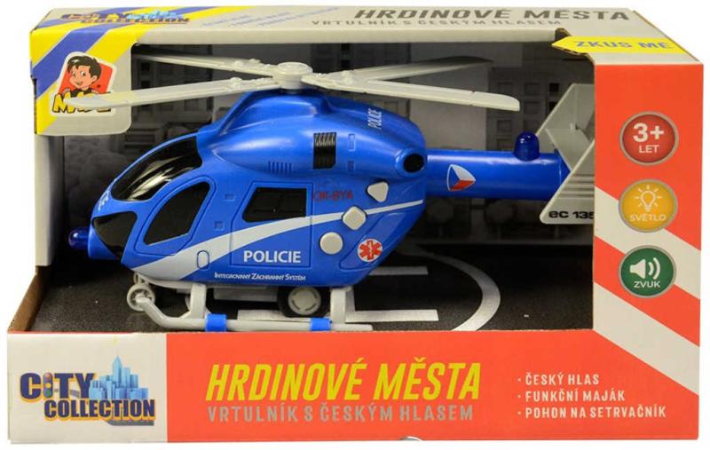 Policejní plastový vrtulník v českém designu s českým hlasem. Vrtulník je na setrvačník a obsahuje světelné a zvukové doplňky. Funkční maják. Hračka se světlem a zvukem na baterie.Simuluje rozhovor dispečinku a pilota: Dispečink: Hromadná nehoda na čtyřicátém kilometru dálnice. Na místě jsou ranění. Ihned se připravte k odletu.