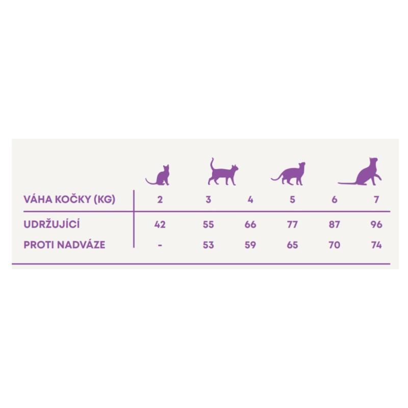 Krmný návod: změnu krmiva je třeba provádět postupně po dobu 7 dní. Jako návod použijte tabulku s dávkováním. Denní množství potravy se může pro každou kočku lišit, záleží na úrovni její aktivity, plemeni a podmínkách prostředí. Denní krmnou dávku podávejte rozdělenou na 2 porce denně, nepoužívejte zbytky krmiva z předchozího dne. Kočka musí mít vždy přístup k čisté, čerstvé vodě. Skladování: skladujte na chladném a suchém místě. Obal by měl být po použití vždy bezpečně uzavřen.