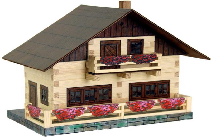 WALACHIA dřevěný model alpského domu k sestavení z řady Hobby Kit.Dřevěná slepovací stavebnice obsahuje dřevěné hranolky daných délek ke stavbě roubených stěn, díly na střechy a štíty, kartonové výseky oken a dveří i předtištěné papírové potisky. Součástí
