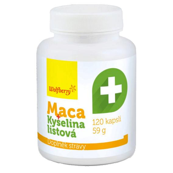 Maca extrakt + Kyselina listová 59 g/120 kapslí Wolfberry. Maca je zdrojem všech nezbytných vitamínů a minerálů. Je rovněž bohatým zdrojem rostlinných sterolů a přírodních estrogenů. Spolu s kyselinou listovou, která se podílí na procesu dělení buněk, se jedná o špičkový produkt, podporující plodnost a následnou graviditu.