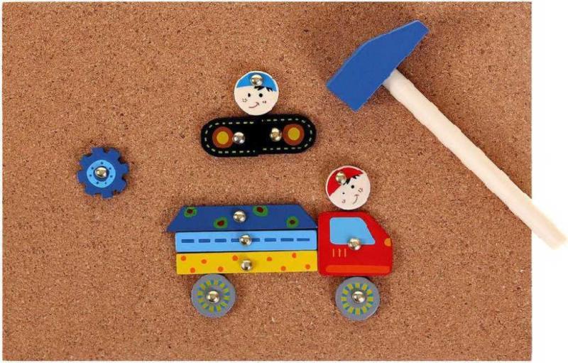 1x korková deska, 2x kladívko, 100 kusů hřebíčků, 126 kusů dřevěných tvarů