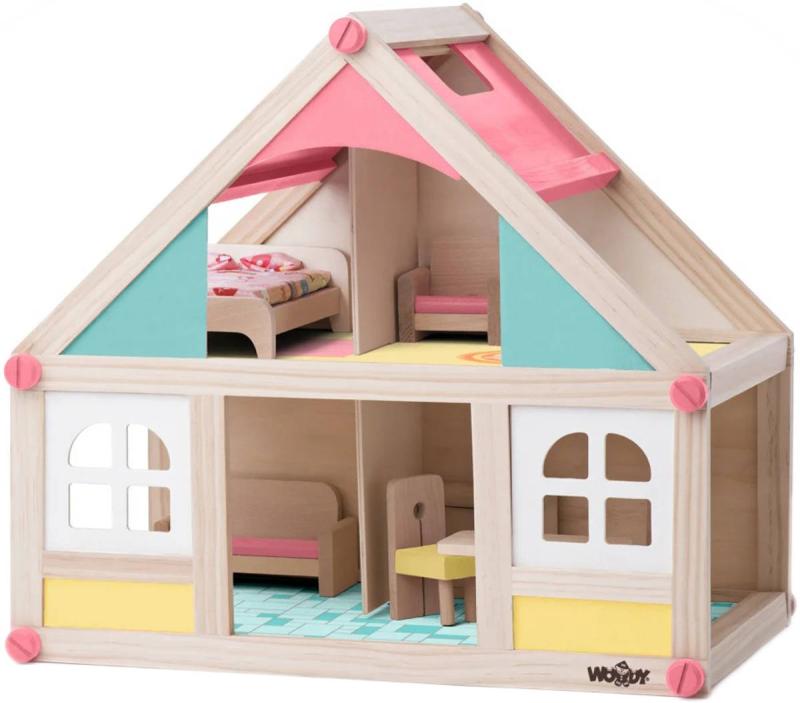 Každá malá holčička si přeje krásný domeček. Udělejte vaší dcerce radost s tímto malým útulným domečkem pro panenky! Domeček je vyrobený z kvalitního materiálu a je chytře navržený. Do všech pater máte snadný přístup. Nechybí ani bohaté příslušenství v podobě nábytku do jídelny, sedací soupravy, skříňky a postele s povlečením. Domeček obývají dvě figurky. Jednou figurkou je blonďatý panáček a druhou je černovlasá panenka. Když už vám bude domeček malý, je k němu možné dokoupit spodní patrovou část, a tak budete mít v domečku opět spoustu místa! Česká značka WOODY - to jsou dřevěné hračky a dřevěné výrobky, zaměřující se na didaktický a motorický rozvoj dítěte, rozvíjení jemné motoriky, kombinatoriky a jednoduchého kreativního a kombinačního myšlení. Klade velký důraz na vysokou kvalitu a bezpečnost. Všechny hračky jsou testovány na nejvyšší mezinárodní standard a většina hraček je zařazena do programu "BEZPEČNÉ HRAČKY - SAFE TOYS".