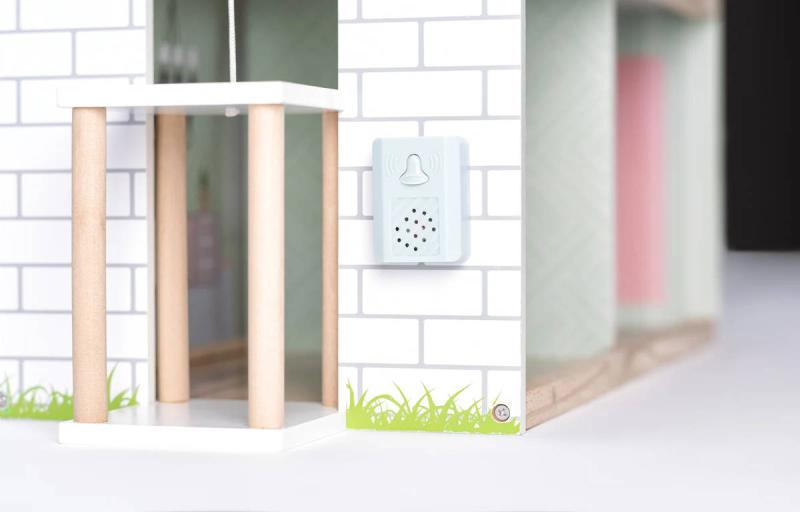 Kvalitní třípatrový domeček pro panenky dodáváme včetně zobrazeného příslušenství (17ks). Nábytek je vyroben z kombinace materiálů dřevo/ plast. Z přízemí do prvního patra se mohou panenky svézt výtahem. U vchodu je umístěn domovní zvonek. Třetí patro je vybaveno nejen prostornou terasou a markýzou, ale i funkčním světlem.