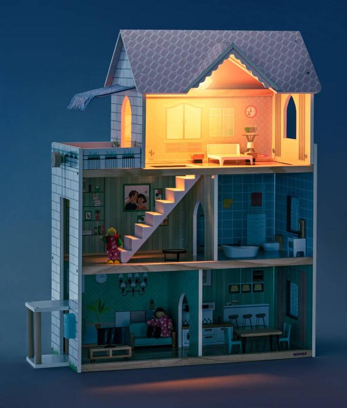 Woody dřevěný třípatrový domek Molly pro panenky. Součástí 2 panenky, nábytek a vybavení, celkem 17ks. Hračka na baterie, se světlem a zvukem.Kvalitní třípatrový domeček pro panenky dodáváme včetně zobrazeného příslušenství (17ks). Nábytek je vyroben z kombinace materiálů dřevo/ plast. Z přízemí do prvního patra se mohou panenky svézt výtahem. U vchodu je umístěn domovní zvonek. Třetí patro je vybaveno nejen prostornou terasou a markýzou, ale i funkčním světlem.