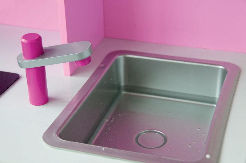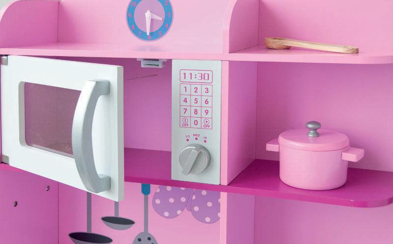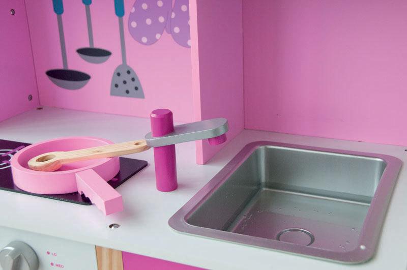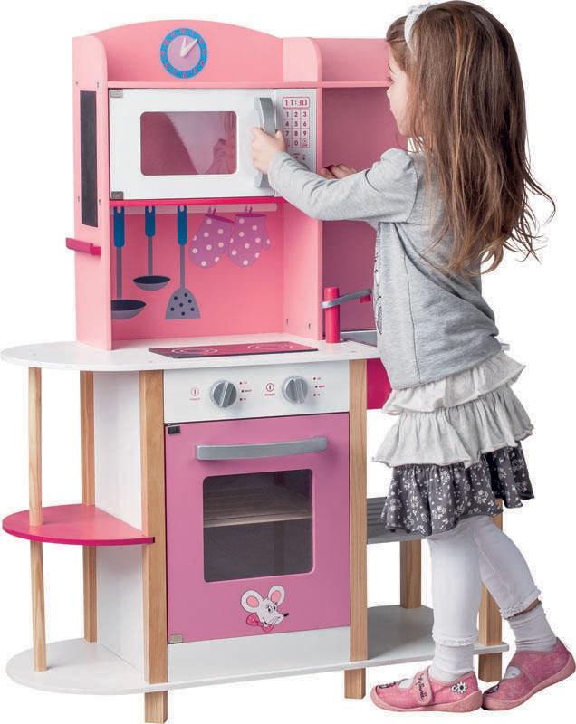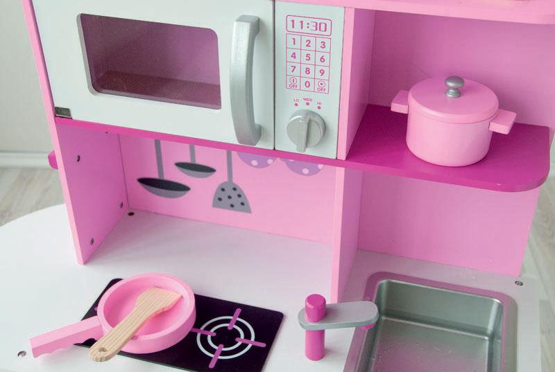 Rozměry dětské kuchyňky jsou: výška 98 cm, šířka 104 cm, hloubka 34 cm. Výška pracovní desky od země je 55 cm.