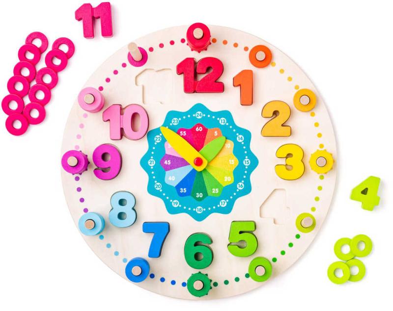 Dřevěné naučné ručičkové hodiny s barevnými vkládacími číslicemi a navlékacími kroužky. Vkládačka & navlékačka. Didaktická hračka, se kterou se dítě naučí vnímat hodiny jako pomůcku pro měření času. Naučí se poznávat číslice a díky barevným kroužkům i hodnotu, kterou představují.