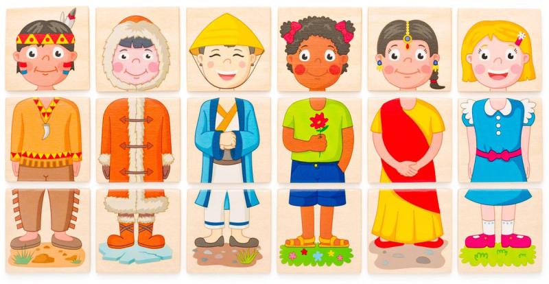 Úkolem dítěte je sestavit postavičku rozdělenou na 3 díly tak, aby odpovídala skutečnosti nebo ji sestavit prostě tak, aby ho to bavilo. Dítě se zde učí poznávat a vnímat rozdílné kulturní tradice každého národa a objevuje tradiční stejnokroje jednotlivých povolání. Design pochází z dílny českého výtvarníka.