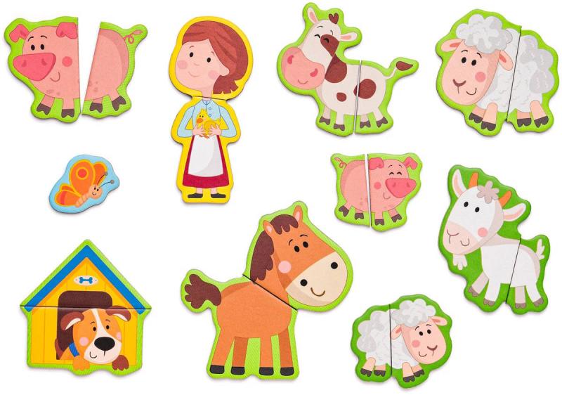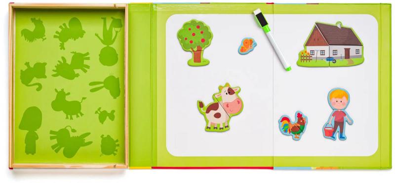 S touto kouzelnou magnetickou skládačkou si můžeš vytvořit svou vlastní farmu! Dřevěná krabička je plná zvířátek, lidiček, domečků a dalších prvků s motivem farmaření. Každý motiv se navíc musí poskládat z více částí. Dítě je umisťuje na magnetické víko s obrázkem statku a louky. Rozvíjí tak kreativitu a jemnou motoriku.