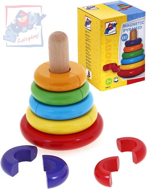 90674 Dětská vkládací pyramida s magnety WoodyPrincip dětské pyramidy spočívá ve skládání kroužků podle velikosti. Návlékáním jednotlivých dílků si děti procvičují motoriku a učí se přesnosti při pohybu