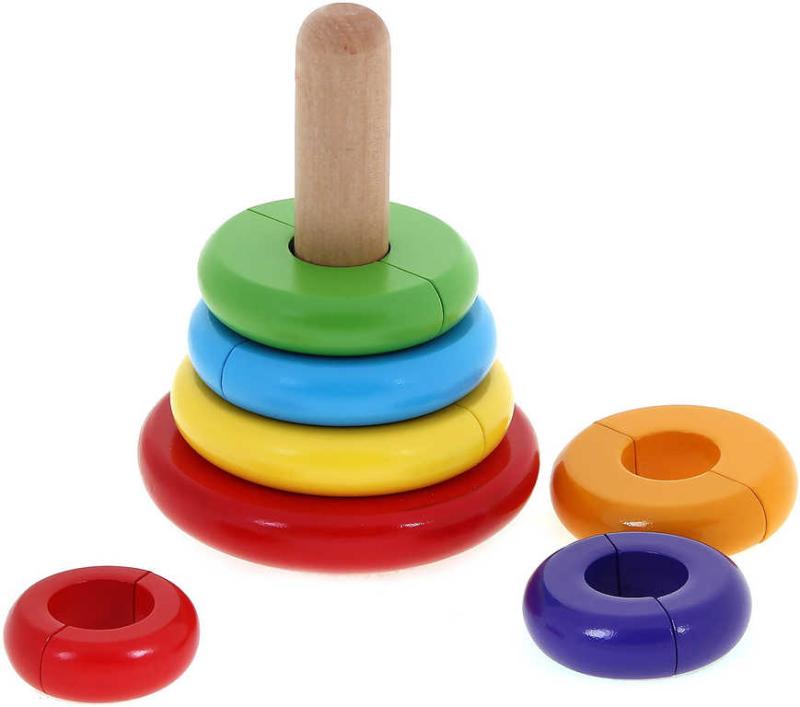 Princip dětské pyramidy spočívá ve skládání kroužků podle velikosti. Návlékáním jednotlivých dílků si děti procvičují motoriku a učí se přesnosti při pohybu