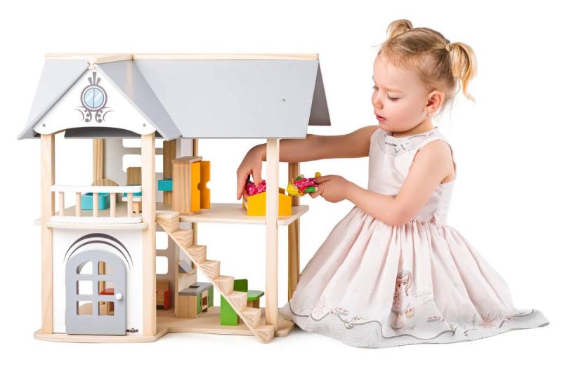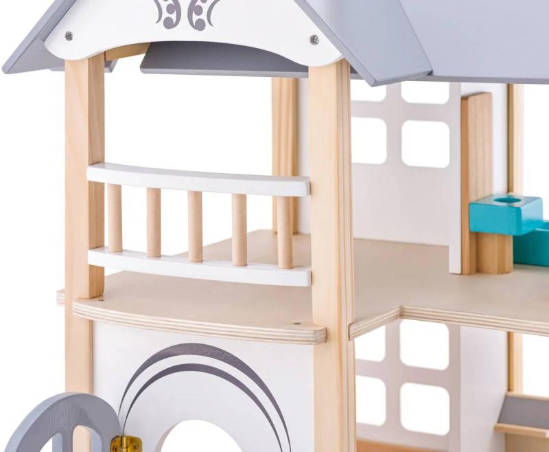 Vila Isabelle od Woody je precizně provedený domeček pro panenky, s množstvím designových a funkčních prvků. 2 panenky součástí.Domek má magnetický odnímatelná balkon, variabilní schody a funkční dveře na pantech. Díky otevřeným prostorům je snadno přístupný ve všech místnostech. Je vyroben v kombinaci materiálů: masivní dřevo a dřevovláknitá deska, čímž je odlehčena celá jeho konstrukce. Všechny místnosti jsou vybaveny nábytkem z masivního dřeva