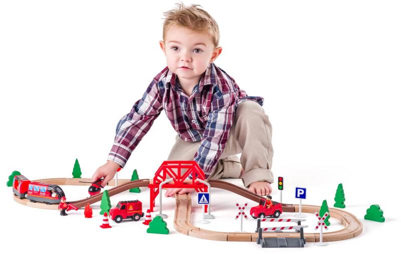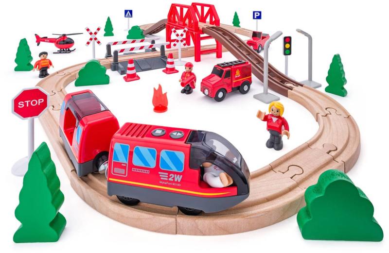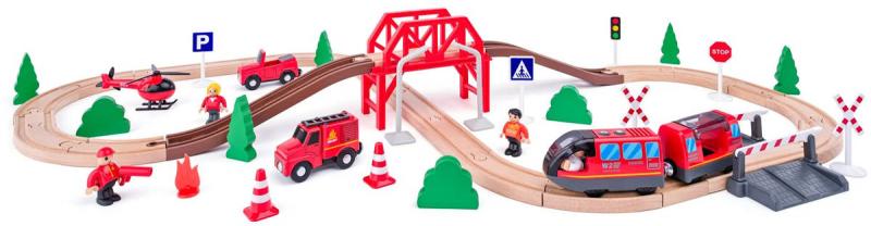 Vláčkodráha s železničním mostem, přejezdem a kombinací kolejí dřevo/plast. Sestava obsahuje elektrickou mašinku pro strojvůdce a jednoho pasažéra, hasičské auto, vrtulník, kabriolet, 4 figurky a další příslušenství. Dráhu lze postavit pokaždé jinak a jednotlivé díly je možné kombinovat i s ostatními vláčkodráhami dostupnými na našem trhu.