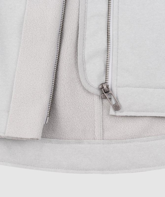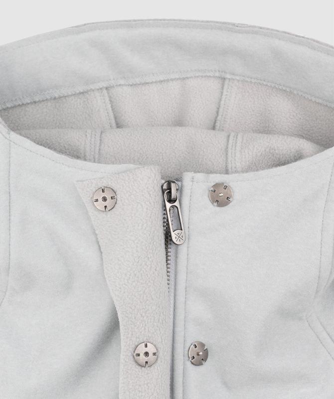 50% recyklovaný polyester, 50% polyester, třívrstvý, pružný materiál s membránou a vnitřním fleecem, vodní sloupec 10 000mm, paropropustnost 5 000g/m2/24h, ocelové zipy, hlavní zip krytý klopou