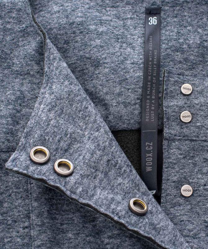 Vyrobeno ve wooxusní dílně v Jeseníku. 100% polyester, 10000 mm voděodolnost, 5 000 g/m2/24h paropropustnost, wooxusní volný střih, stretchový matroš, zapínání skrytými druky, nenápadné a přitom pohodlné kapsy.
