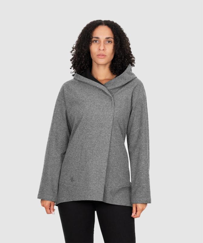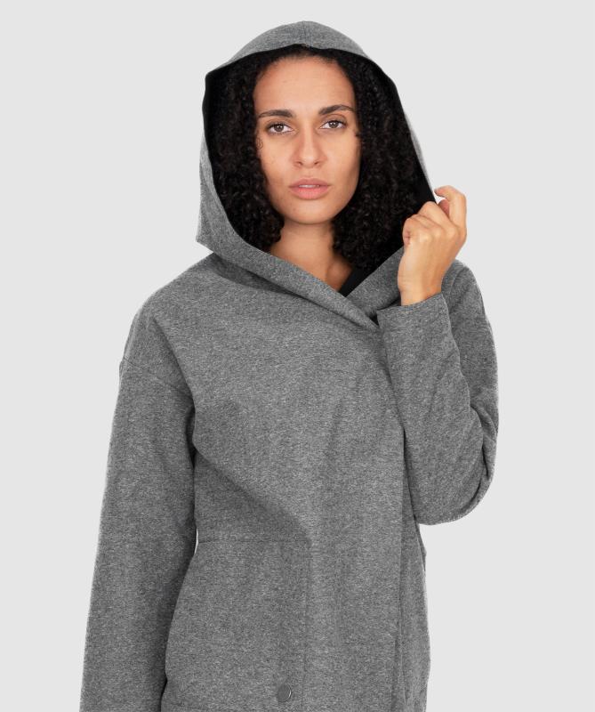 100% polyester, 10000 mm voděodolnost, 5 000 g/m2/24h paropropustnost, stretchový matroš, zapínání skrytými druky, nenápadné a přitom pohodlné kapsy, lehký wooxusní styl s větší kapucí.