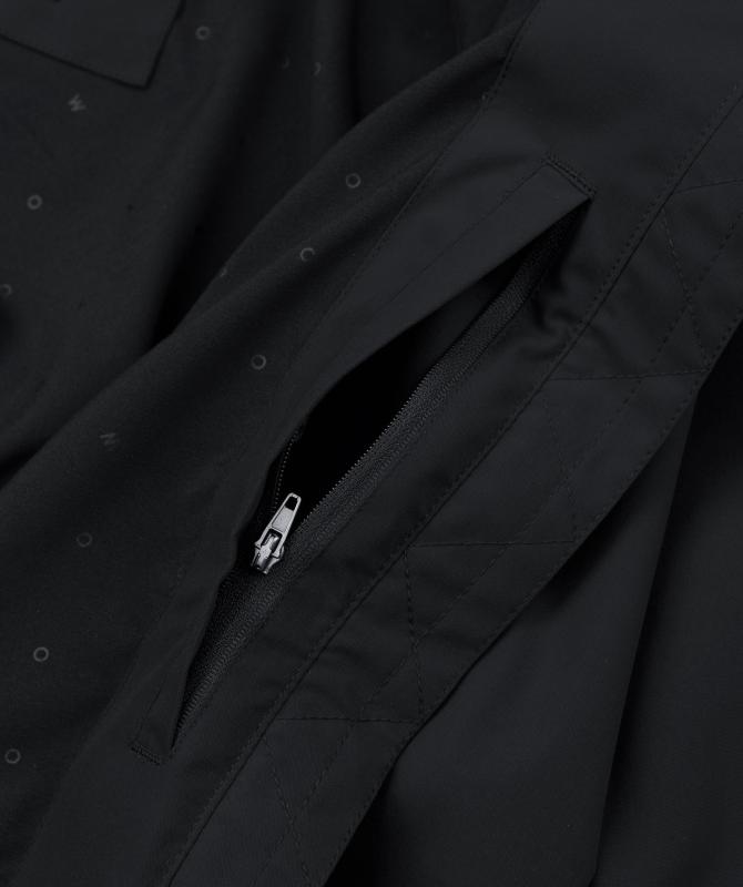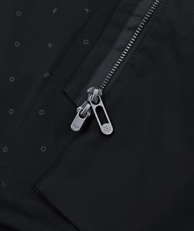 Svrchní materiál 100% polyester pružné konstrukce, podšívka 100% recyklovaný polyester, voděodolnost 8000 mm, paropropustnost 5000 g/m2/24h, povrchová voděodpudivá úprava materiálu DWR PFC free, podlepené švy, ocelové zipy, vnitřní stahování v pase, lištové boční kapsy uzavíratelné na zip