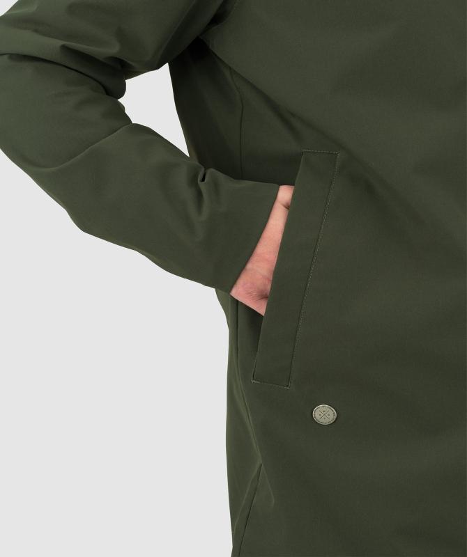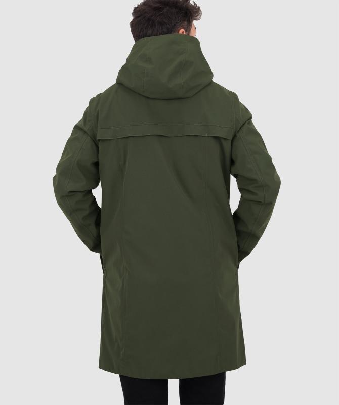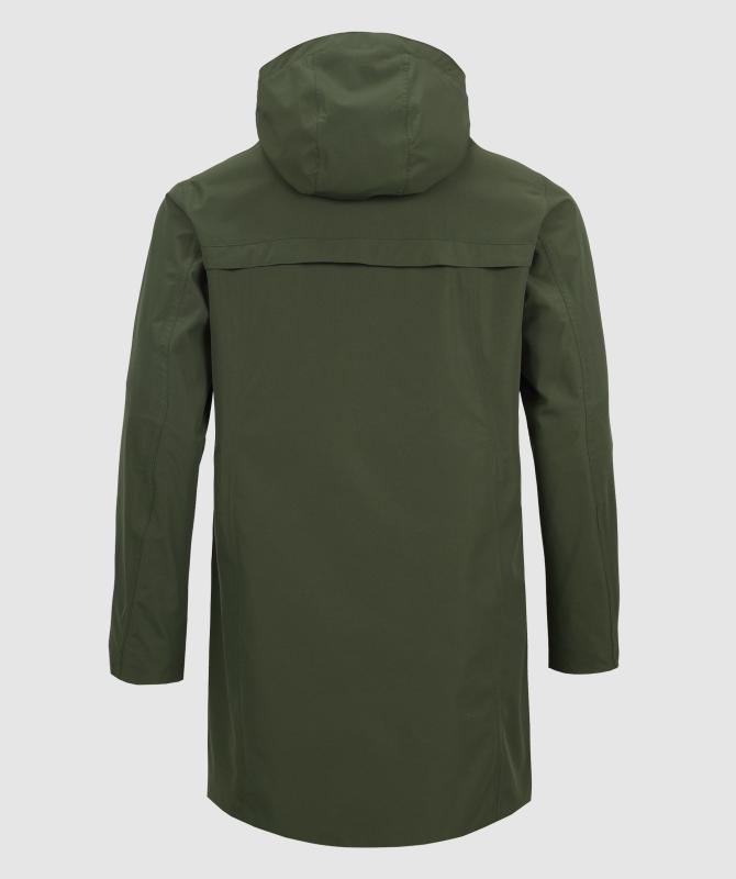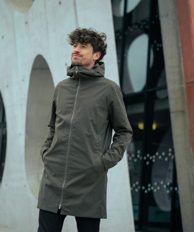 Jdete lesem, mrholí a pofukuje. Před vámi kopec, za ním už začnete sestupovat do města. Nevadí vám déšť – membrána ho zadrží. Je příjemné stoupat, pružný a prodyšný materiál vás neomezuje v pohybu. Cítíte se fajn, je skvělé být v přírodě. Ale těšíte se mezi lidi protože vám to dneska děsně sekne. Upravíte stahování v kapuci a vyrazíte do ulic. Umí tohle váš kabát?- strečový materiál bez elastanu