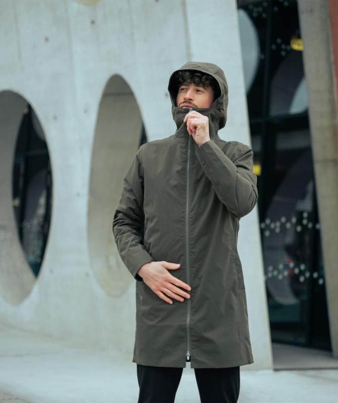 Idete lesom, mrholí a fúka. Pred vami kopec, za ním už začnete zostupovať do mesta. Nevadí vám dážď – membrána ho zadrží. Je príjemné stúpať, pružný a priedušný materiál vás neobmedzuje v pohybe. Cítite sa fajn, je skvelé byť v prírode. Ale tešíte sa medzi ľudí, pretože vám to dneska strašne sekne. Upravíte sťahovanie v kapucni a vyrazíte do ulíc. Vie to toto váš kabát?- strečový materiál bez elastanu