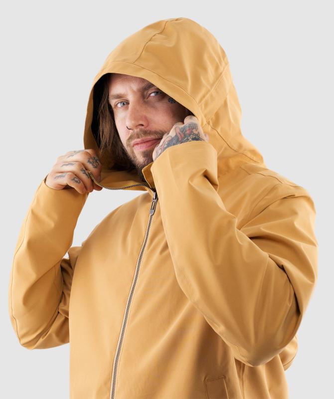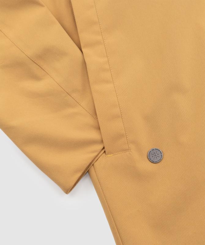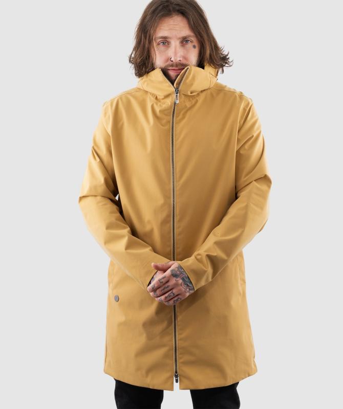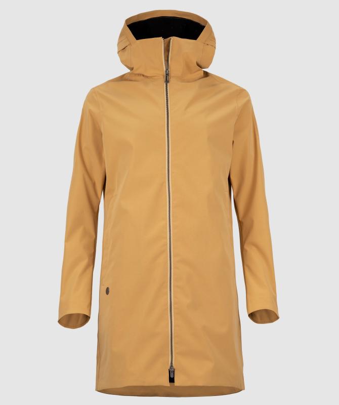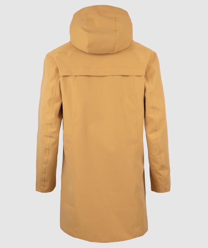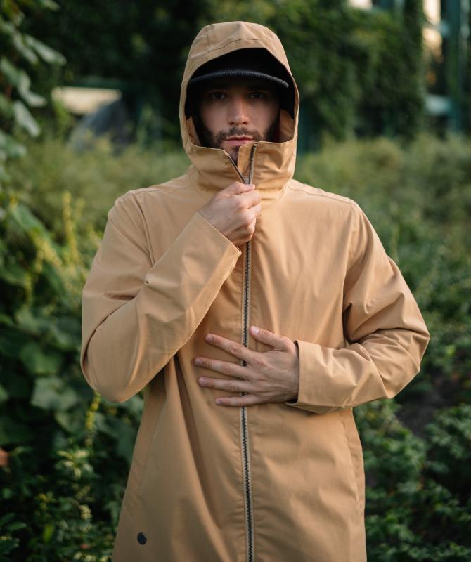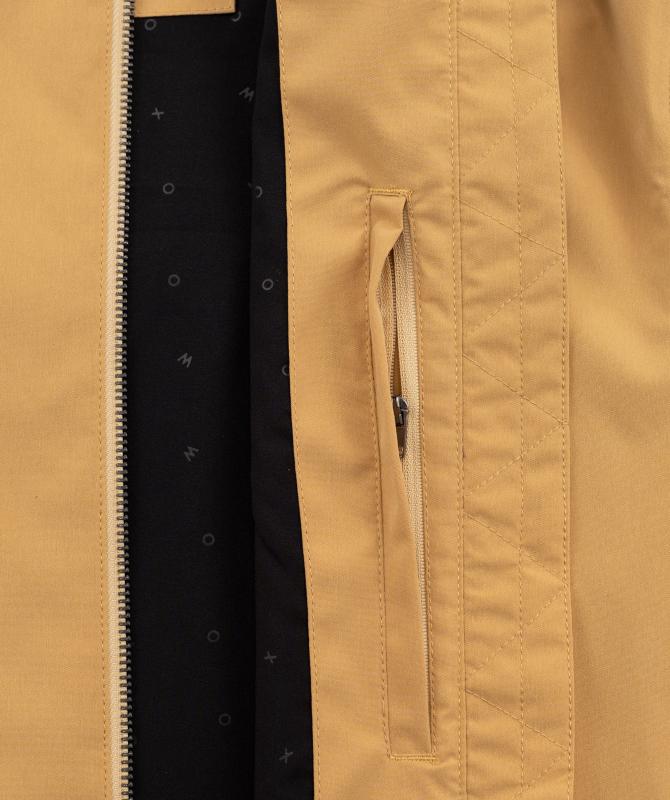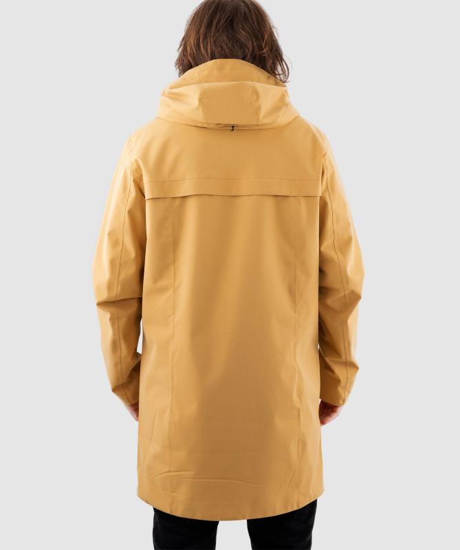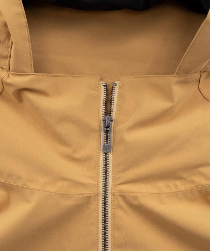 Vrchný materiál 100% polyester pružnej konštrukcie, podšívka 100% recyklovaný polyester, vodeodolnosť 8000 mm, paropriepustnosť 5000 g/m2/24h, povrchová vodeodpudivá úprava materiálu DWR PFC free, podlepené švy, oceľové zipsy, horizontálne sťahovanie kapucne, ventilácia na chrbte