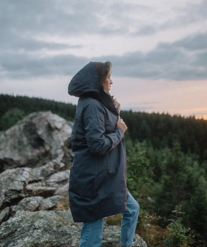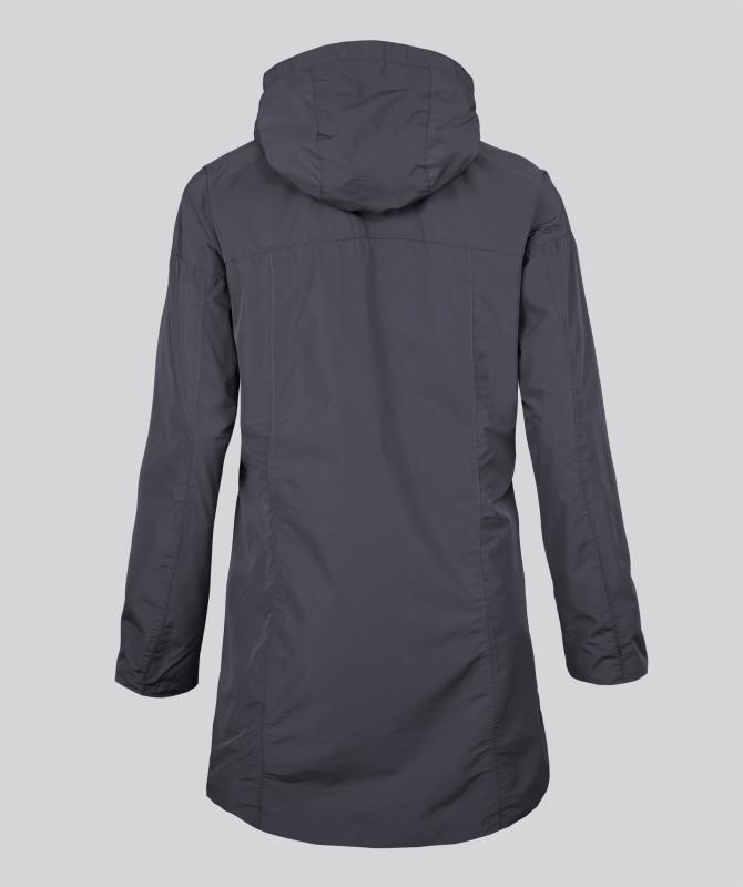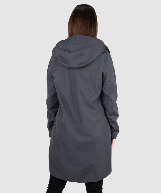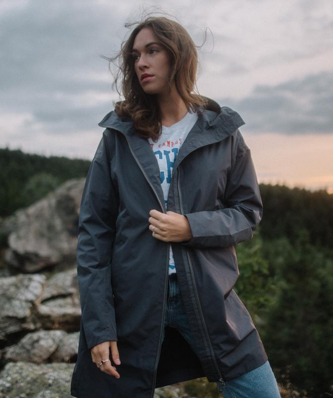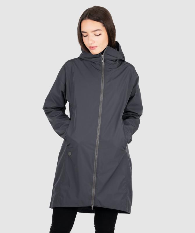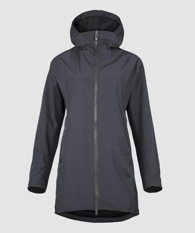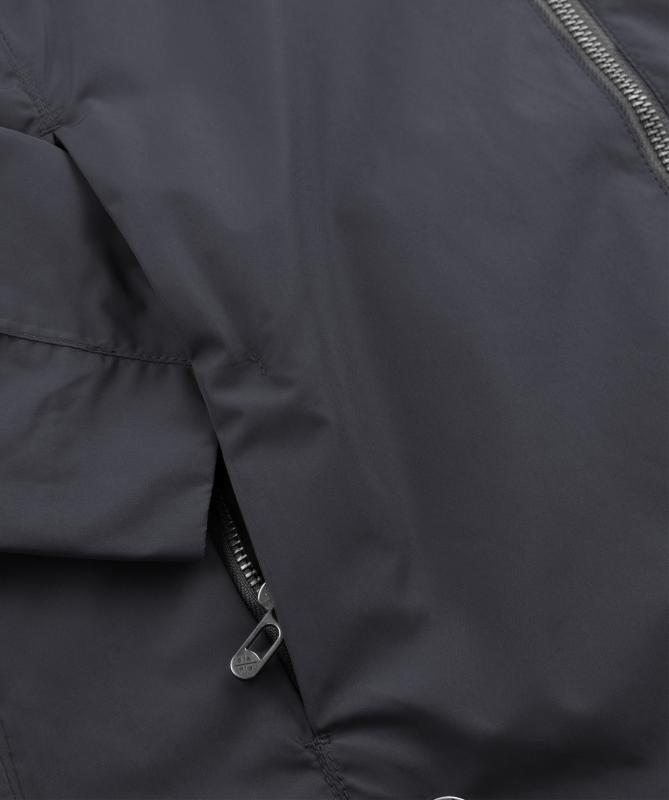 Bunda voľnejšieho strihu so spadnutým rukávom, 100% recyklovaný polyester, vodeodolnosť 8000mm, paropriepustnosť 3000g/m2/24h, vodeodpudivá povrchová úprava - DWR PFCfree, hlavný dvojcestný kovový zips, dve hlavné vrecká uzatvárateľné na skrytý zips, vnútorné priestranné vrecko na zips, predĺžený zadný diel, podlepené švy, pružná wooxusná podšívka, nastaviteľná kapucňa.