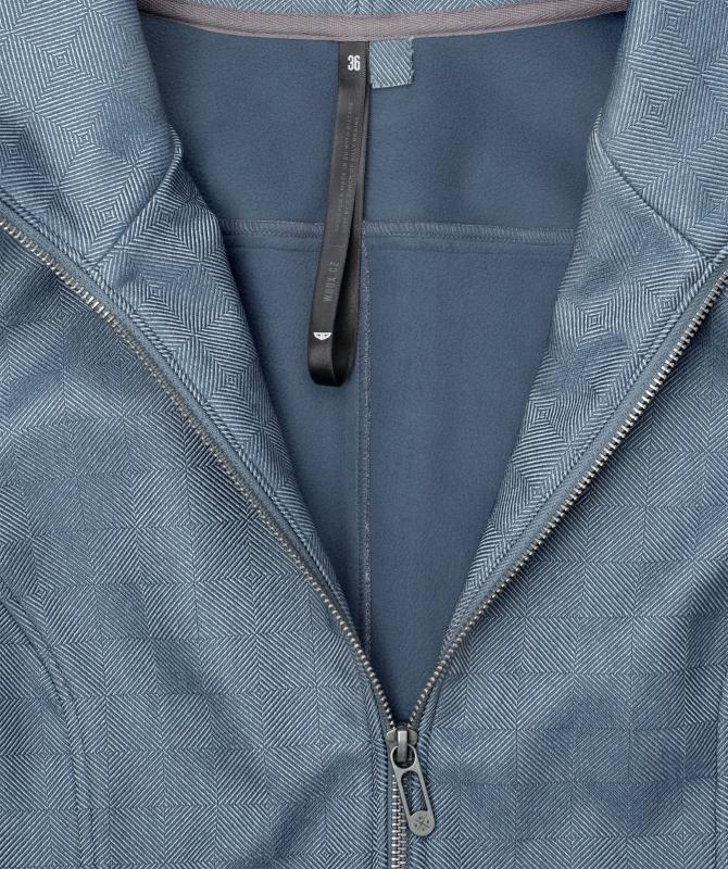 98% polyester a 2% elastan, zapínání na kovový zip, vodní sloupec 10000mm, paropropustnost 10000g/m2/24h, skvěle padnoucí wooxusni střih z jesenické dílny.