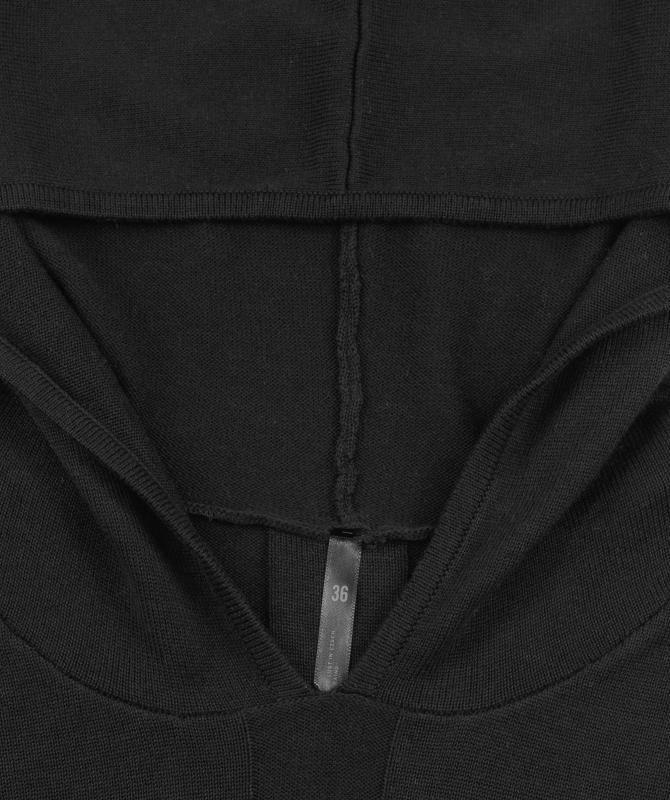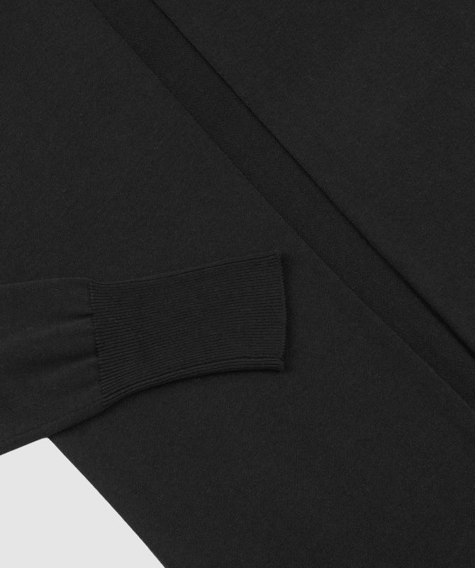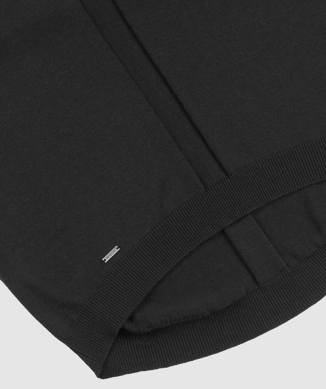 Střih svetru je šatový s mírně spadenými rukávy, které jsou zakončené širokým žebrovaným lemem. Tento detail přispívá k jeho formální ležérnosti, která se hodí jak do práce, tak na volný čas. Svetr v barvě Pantone Black Beauty představuje decentní a univerzální doplněk, který snadno zkombinujete s ostatním oblečením.