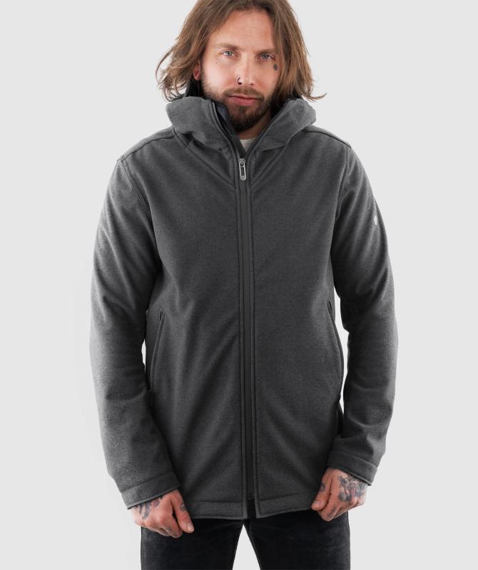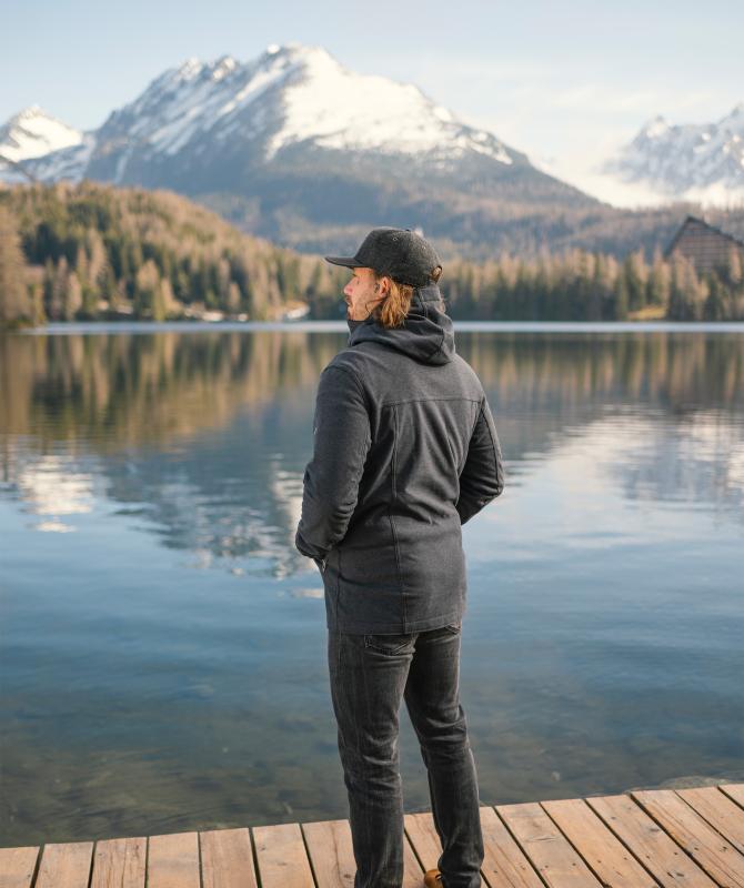50% recyklovaný polyester, 50% polyester, trojvrstvový, pružný materiál s membránou a vnútorným fleesom, vodný stĺpec 10 000mm, paropriepustnosť 5 000g/m2/24h, vodeodolné zipsy, hlavné vrecká uzatvárateľné na zips