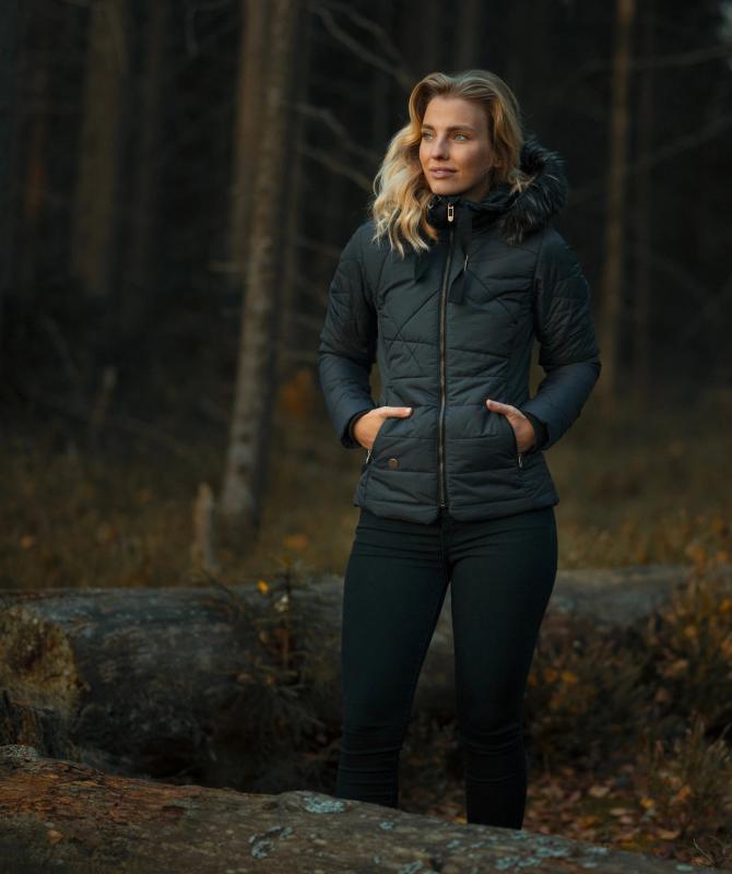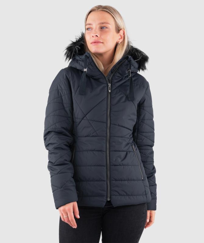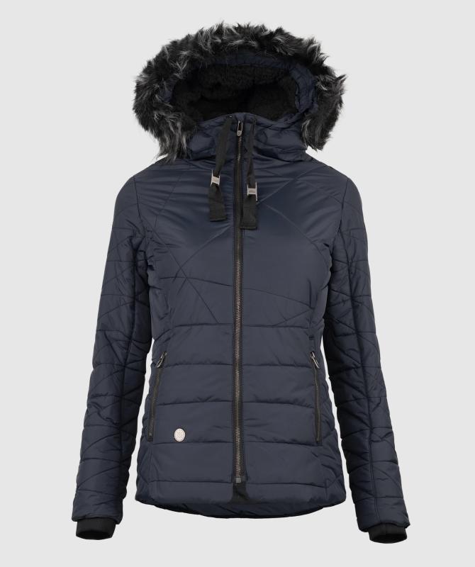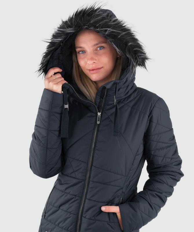 100% recyklovaný nylon, vodeodolnosť 8000mm, paropriepustnosť 3000g/m2/24h, povrchová úprava - DWR PFC free, sťahovacia kapucňa, odnímateľný kožušinový lem kapucne, kovové zipsy, zateplenie Sofeelate - telo 200g/m2, rukáv a kapucňa 150g/m2, vnútorná uzatvárateľná kapsa na zips, wooxusná podšívka, rebrovaný lem na koncoch vnútorných rukávov.