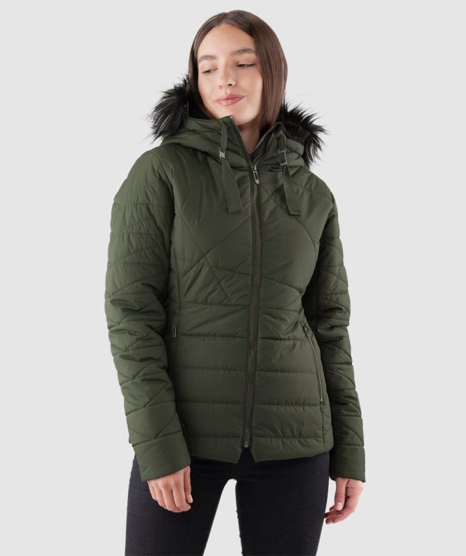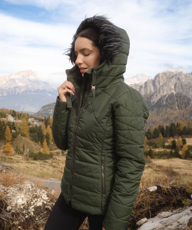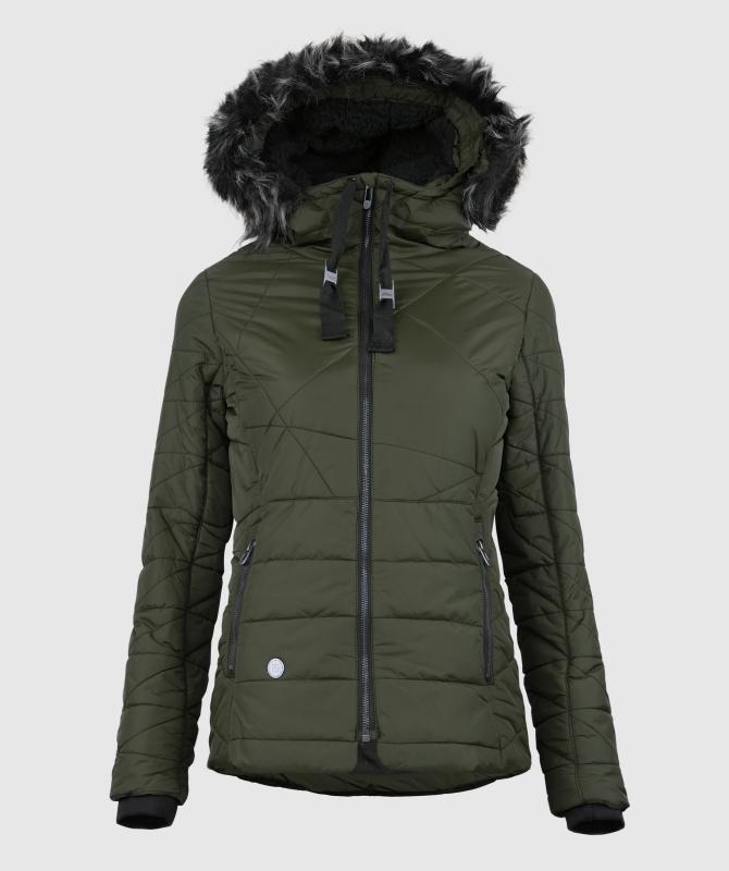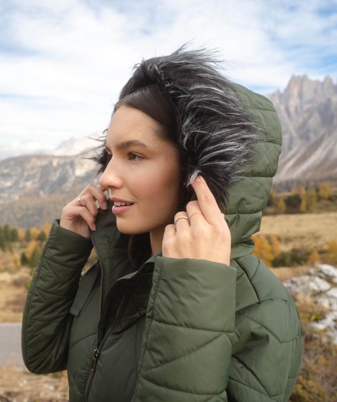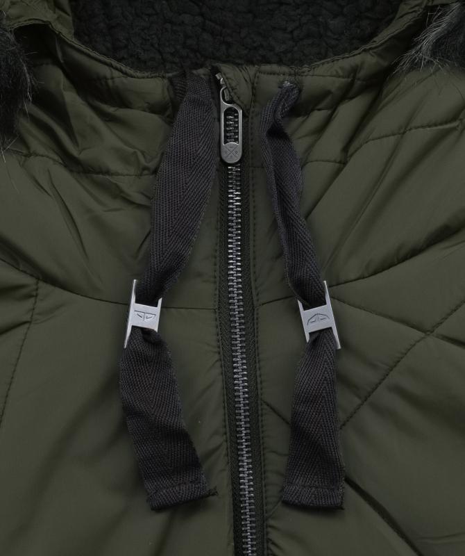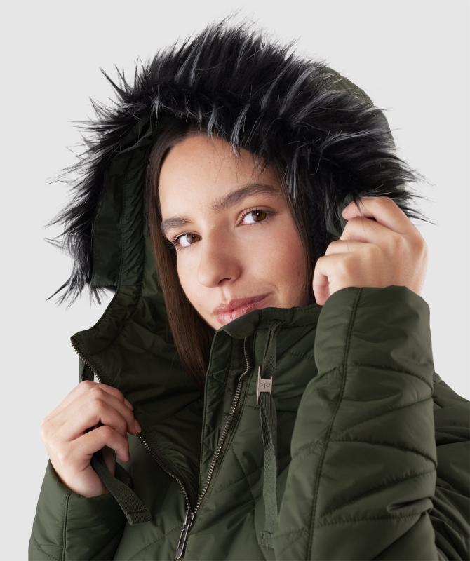 100% nylon, vodeodolnosť 8000mm, paropriepustnosť 5000g/m2/24h, povrchová úprava - DWR PFC free, sťahovacia kapucňa, odnímateľný kožušinový lem kapucne, kovové zipsy, zateplenie v tele 200g/m2, rukávy a kapucňa 150g/m2, vnútorná uzatvárateľná kapsa na zips, wooxusná podšívka, rebrovaný lem na koncoch vnútorných rukávov.
