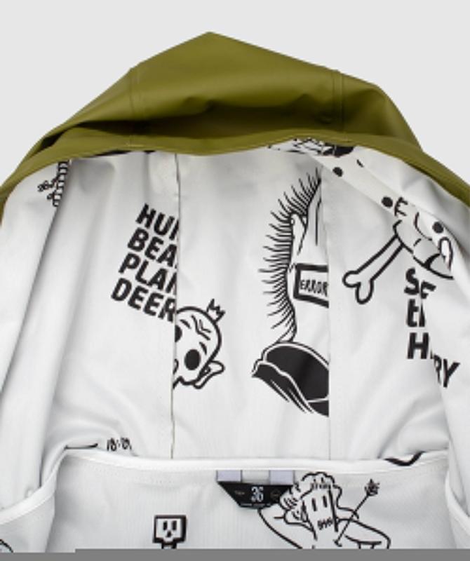 Pohodlný nepremokavý pršiplášť s potlačenou podšívkou, 55% polyuretán a 45% polyester, zapínanie na cvoky, bočné vrecká prekryté lištou, lepené švy, sťahovacia kapucňa, nastaviteľné rukávy so zapínaním na cvok.