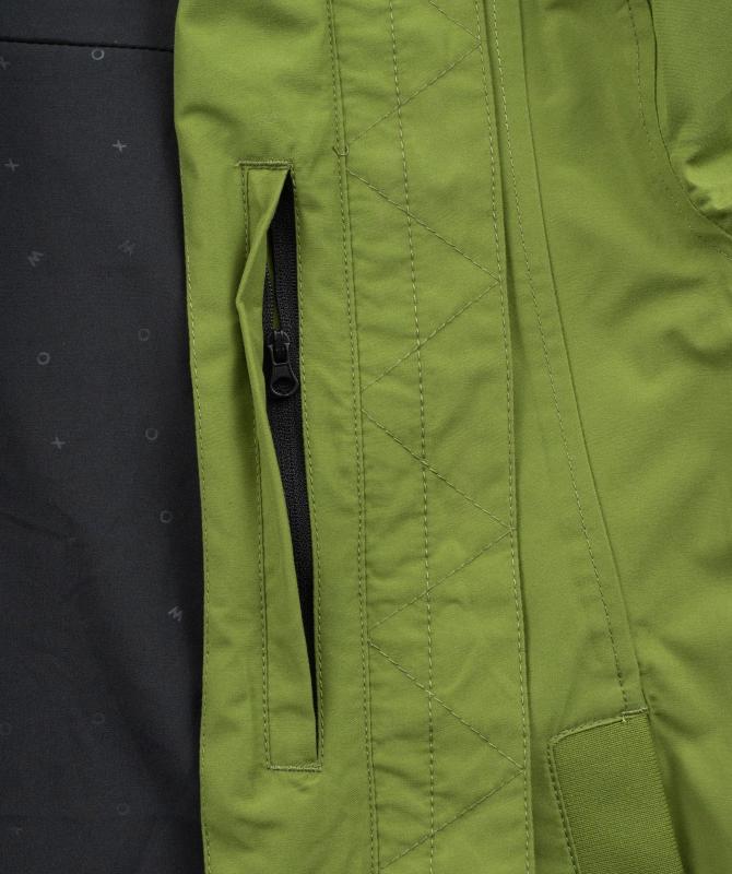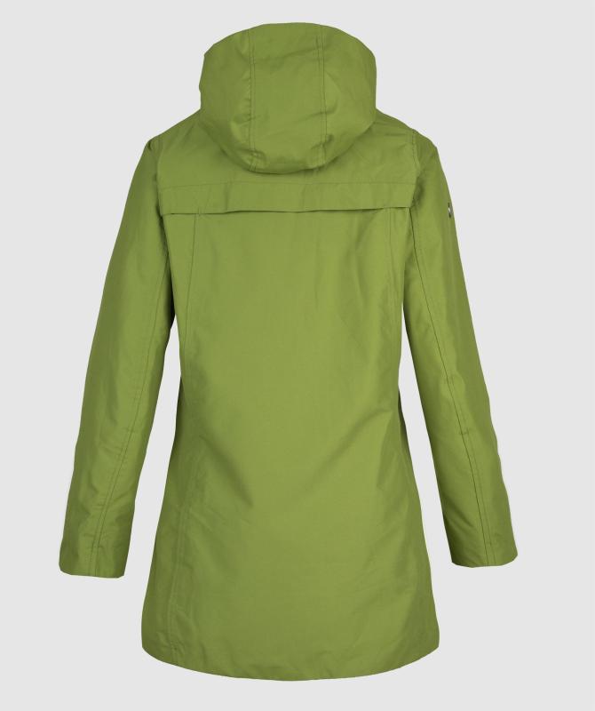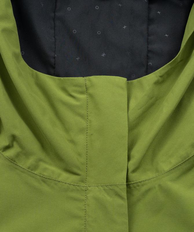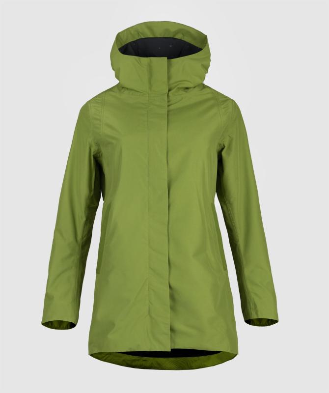 100% recyklovaný polyester, vodeodolnosť 8000mm, paropriepustnosť 3000g/m2/24h, povrchová úprava - DWR PFC free, wooxusná pružná podšívka, hlavný dvojcestný kovový zips prekrytý klopou, hlavné lištové vrecká ukončené ozdobným lemom, odvetrávanie na chrbte, vnútorné vrecko uzatvárateľné na zips, tvarovaná spodná dĺžka.